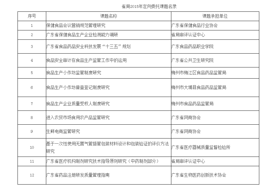 為通過科技創(chuàng)新,提高食品藥品監(jiān)管水平,省食品藥品監(jiān)督管理局大力開展科技創(chuàng)新活動,于近日啟動了“食品安全審計在食品生產(chǎn)監(jiān)管工作中的運用”等12個定向委托課題的系列研究,針對目前監(jiān)管工作的熱點、難點問題,著眼于食品藥品監(jiān)管理論、機制和監(jiān)管手段的研究,將為全省食品藥品監(jiān)管工作提供指引。 本次研究項目是省局首次以定向委托課題的形式開展的科技創(chuàng)新活動,將過去分散在機關處室的課題納入省局總體科技工作進行統(tǒng)籌安排,從課題計劃入手,抓年度安排;從課題過程管理入手,抓課題的組織、實施、監(jiān)督及結題驗收工作;從結果入手,重點落實績效管理,力爭將最新研究成果應用于監(jiān)管工作,提高監(jiān)管效能。 附:《省局2015年定向委托課題名錄》